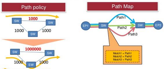 如上述右图所示,不同的流(三种颜色)可以给定不同的Path policy,比如Path map可以做到尽管源点和汇点相同,但是可以走不同的路径。